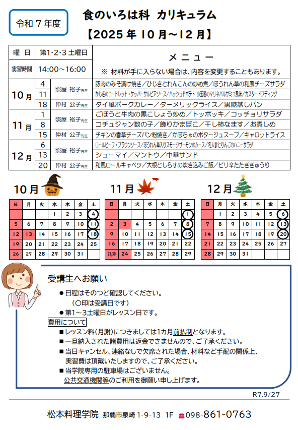 土曜日 14:00~16:00 | 照屋 裕子 先生(第1,2週) 仲村公子先生(第3週) | 〇 | 〇 | 〇 |