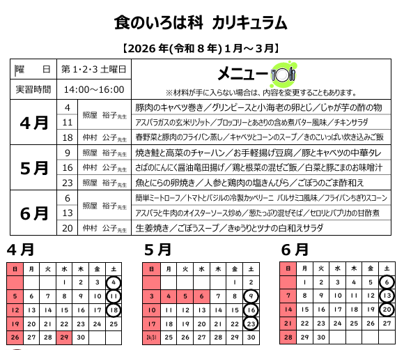 | 講師 | 4月 | 5月 | 6月 | |